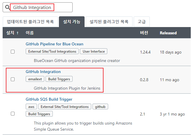 jenkins 웹페이지에서 Jenkins 관리 → 플러그인 관리 → 설치 가능을 선택 후 GitHub Integration을 설치 해주세요.