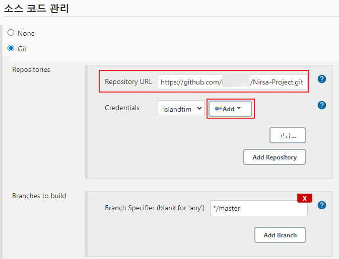 아래와 같이 git 클릭 → URL 입력 → Add 클릭 순으로 해줍니다. 그런 후 빌드 유발 → GitHub hook trigger for GITScm polling 를 체크 후 저장 해주세요.