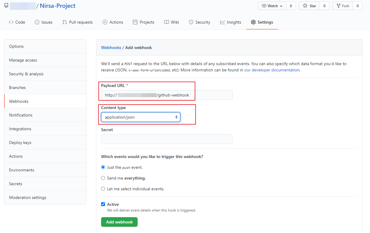 Payload URL은 http://{IP}:{Port}/github-webhook 으로 작성하시면 됩니다. 도메인이 있으시면 도메인으로 작성하셔도 되는것으로 보이며, 만약 집에서 테스트용으로 사용중이신거라면 포트포워딩 등을 통해 진행 하셔야 합니다.