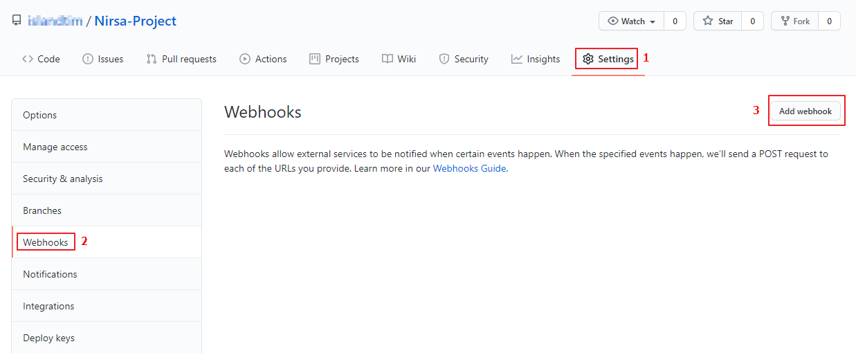 github의 프로젝트에 들어간 후 우측 상단 Settings → Webhooks → Add webhook 클릭 해주세요.