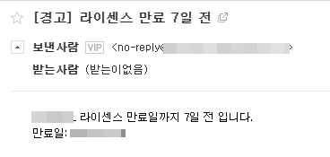 또는 license 파일에서 직접 날짜를 변경하여 실행해보고 잘 작동하는지 확인할 수 있습니다. 정상적으로 작동할 경우 아래와 같이 메일이 옵니다.