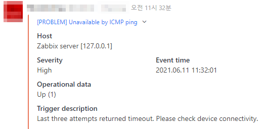 아래와 같이 알람 수신을 확인하면 끝 입니다. 알람이 잘 동작하는걸 확인 하셨다면 위에서 수정한 ICMP 트리거 설정을 =0 으로 원복 해주시면 됩니다.