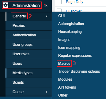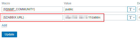 3. Administration → General → Macros → {$ZABBIX.URL} 전역 변수 추가