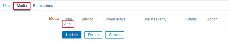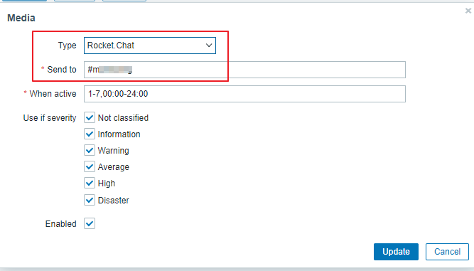 Media → Add 버튼을 클릭한 후 아래와 같이 Type은 Rocket.Chat을 작성 해주세요. Send to 필드는 알람 받을 채널명을 입력 해주시면 됩니다. (ex. 비공개 채널: #test / 특정 사람: @user)