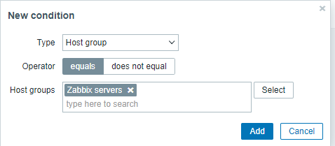 ※ Conditions 필드의 경우 어떤 서버들을 대상으로 Action할지에 대한 조건부 입니다. zabbix server로 테스트할 생각이라면 아래와 같이 설정 해주시기 바랍니다.
