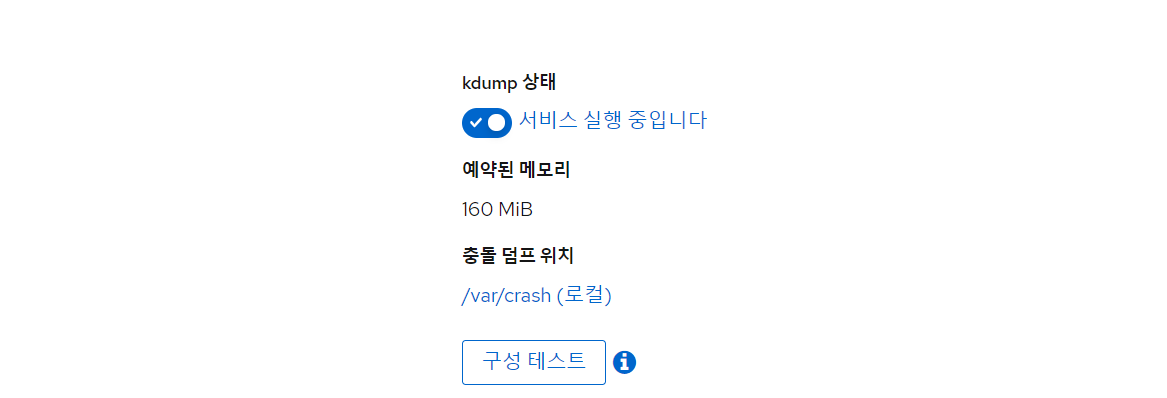 - 커널 덤프 : kdump 설정에 대한 내용 입니다. "구성 테스트" 버튼을 클릭해 커널을 크래쉬하여 테스트해볼 수 있으나, 특정 서비스들이 재시작될 수 있으니 테스트 서버에서 해보시는걸 추천 드립니다.