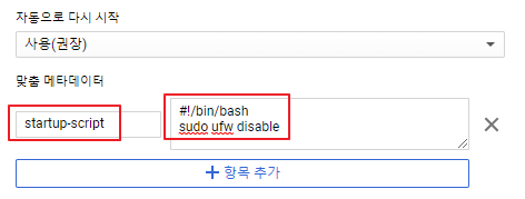 아래로 내리다보면 "맞춤 메타데이터"가 있습니다. 아래 사진과 같이 키에 startup-script를 입력한 후 값에 sudo ufw disable을 입력 해주시면 됩니다. (우분투 기준) 이후 "저장"을 클릭 해주세요.