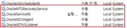 아래 이미지에 보이는 OracleMTSRecoveryService, OracleServiceXE, OracleXEClrAgent, OracleXETNSListener 4가지 서비스가 모두 실행중이어야 합니다.