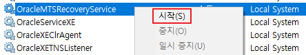 서비스 시작은 해당 서비스 우클릭 후 시작 버튼을 누르시면 되며, 위에 언급한 4가지 서비스를 모두 실행한 후 오라클에 다시 접근 해보시면 정상적으로 실행 됩니다.