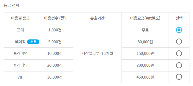 이용정책에 따르면 이용권은 1개월을 기준으로 유효기간이 설정되며 무료 이용권(월 1,000건)의 경우 재사용이 불가능 했습니다.