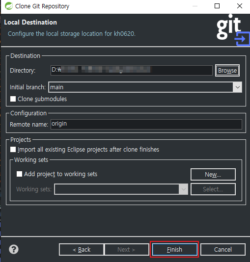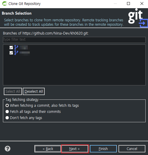 8. Repository 클릭하면 위에서 설정했던게 나옵니다. 클릭 후 Finish 해주면 깃허브 연동 끝 입니다~