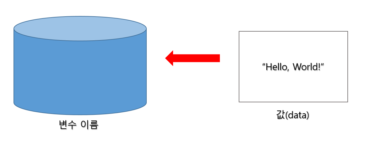 변수란 어떠한 값(data)를 저장할 수 있는 저장 공간을 뜻합니다. 왼쪽에 작은 박스가 있고, 그 안에 내가 원하는 물건(값)을 넣는 그림을 생각하셔도 됩니다.