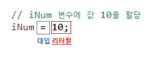 위에서 변수 선언을 먼저 했다면 데이터 타입을 제외하고 작성하여 변수 초기화, 즉 변수에 값을 할당할 수 있습니다. 이렇게 변수에 값을 할당하는 과정을 `변수 초기화`라고 하며 넣으려는 값은 `리터럴`이라는 용어를 사용하기도 합니다.