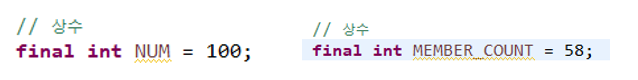 변수를 초기화 할 때 데이터 타입 앞에 final을 붙이면 상수가 됩니다. 상수는 단 한번만 저장되고 그 이후에는 변경할 수 없는 값을 뜻하고, 관례적으로 병수명을 지을 때 모두 대문자로 지으며 단어 사이에 언더바(_)를 넣어 대문자로 이루어진 변수명을 사용합니다.