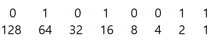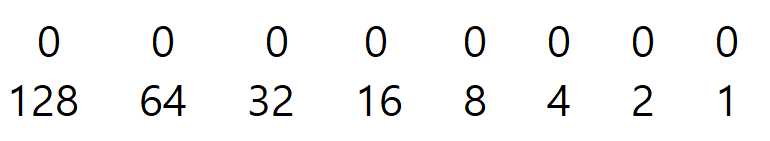 각각의 데이터는 2의 n승으로 계산할 필요 없이 아래와 같이 위에는 비트 자리를, 아래는 숫자를 128 ~ 1까지 적어놓으면 편하게 계산할 수 있습니다. 비트에 있는 자리가 1이 오르면, 아래에 있는 숫자를 더하면 됩니다.