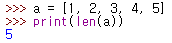 요소 5개가 들어있는 리스트 a를 생성하고 len(a) 를 사용하여 요소 개수를 구하니 정확히 5개가 나왔습니다.