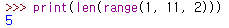 range를 사용할때 len 을 이용하면 range를 사용해서 생성한 숫자의 개수를 구할 수 있습니다. print(len(range(1, 11, 2))) 을 입력하면 range로 1부터 10까지 2칸씩 건너뛰므로 1, 3, 5, 7, 9 총 5개의 숫자가 생성 되는데, 이때 len으로 인해 총 생성된 숫자인 5가 출력 됩니다.