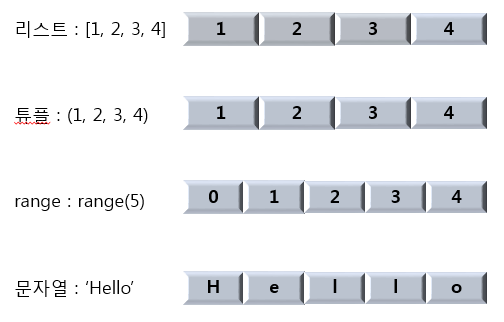 파이썬에선 아래 이미지와 같이 각각의 요소들이 연속적으로 이어진 자료형을 시퀀스 자료형(sequence types) 라고 합니다. (bytes 와 bytearray 도 있습니다)