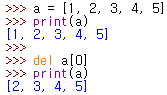 1~5가 들어있는 시퀀스 객체의 0번째 인덱스(값1)를 삭제하니 뒤에 있던 요소들의 인덱스가 모두 앞당겨졌습니다.