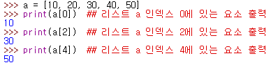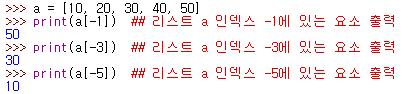 요소는 5개인데, 인덱스 4가 값이 50인 요소를 출력 해왔습니다. 인덱스는 0부터 시작하기 때문에 시퀀스 객체에 있는 요소의 개수보다 1개가 적습니다.
