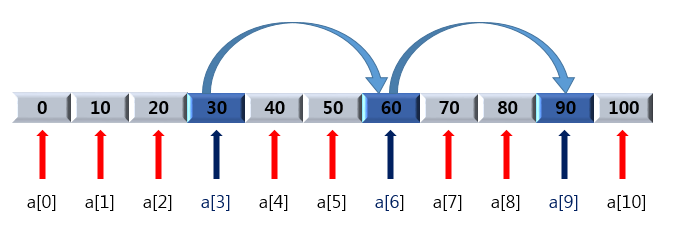 1편에서 말한것과 같이 슬라이스를 사용할때에 끝 인덱스에 적은 숫자 -1 까지 요소에 접근하게 되니 a[3:10] 을 사용하면 a[3] ~ a[9] 까지 접근하게 됩니다. 여기서 a[3:10:3], 즉 a[3] 부터 a[9]까지 요소에 접근하되 증가폭이 3 이기 때문에 위의 이미지와 같이 요소에 접근 합니다.