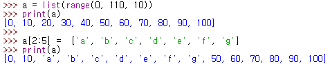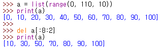 * 단 튜플, range, 문자열은 del을 사용하여 슬라이스를 삭제할 수 없습니다.