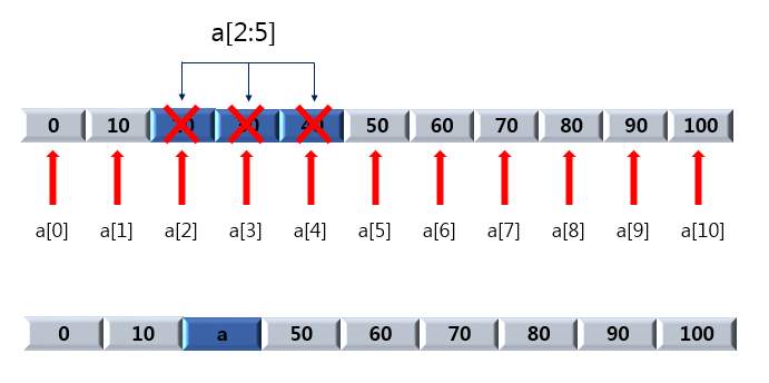 슬라이스 또한 요소를 삭제할때는 del 슬라이스객체[시작인덱스:끝인덱스] 를 사용하시면 됩니다.