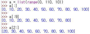 a[:] 안에 시작 인덱스던 끝 인덱스던 비어두면 처음 또는 마지막을 의미하게 됩니다. 이런것들을 사용하여 당연히 증가폭도 사용 됩니다. (ex. a[2:10:3])