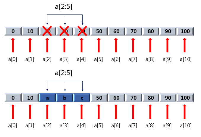 a[2:5] = ['a', 'b', 'c'] 를 입력 후 출력해보니 20, 30, 40 이 들어있어야 할 자리에 a, b, c 가 할당 되었습니다. 시작 인덱스, 끝 인덱스를 맞추지 않아도 상관은 없지만 확인해야할 점이 있습니다.