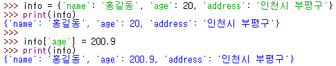 info['age'] = 200.9 를 사용하여 딕셔너리 info 에 있는 age 라는 키를 찾아서, 값은 200.9 로 변경 하였습니다.