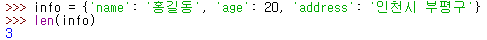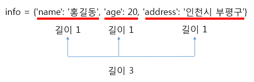 키-값 한쌍이 길이 1이기 때문에 len(info) 로 길이를 구할 때 위의 상황에는 길이 3으로 출력됩니다.