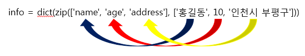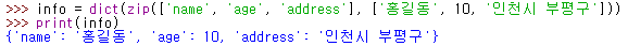 - 딕셔너리 = dict(zip([키1, 키2 …], [값1, 값2 …]))