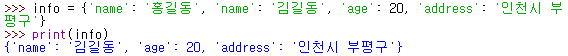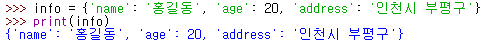 - 딕셔너리 = dict({키1: 값1, 키2: 값2})