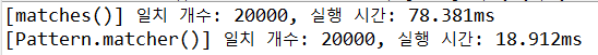 System.out.println("[Pattern.matcher()] 일치 개수: " + count2 + ", 실행 시간: " + (end2 - start2) / 1_000_000.0 + "ms");