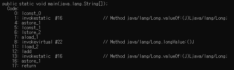 1: invokestatic #16 // Long.valueOf(long) → 오토박싱