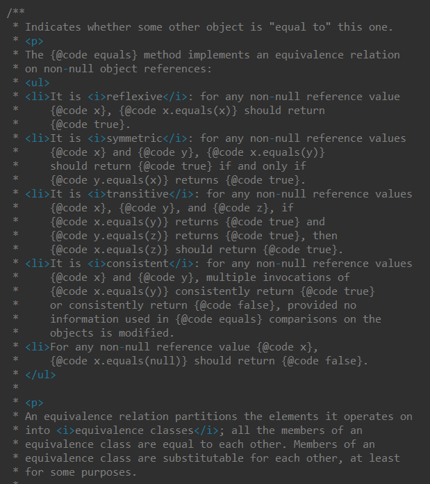 Object 명세에 작성된 내용을 확인해보면 equals 메서드는 널이아닌 객체들에 대해 동치 관계(equivalence relation)을 만족해야 하며 아래의 조건들을 지켜야 한다는 내용이 있습니다. 아래와 같이 크게 5가지로 이루어집니다.