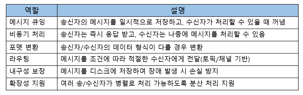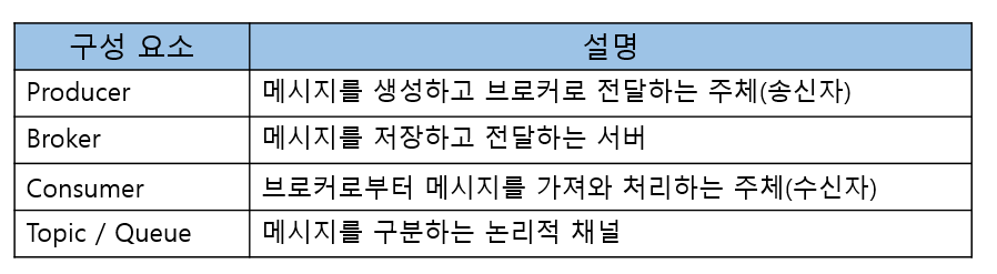 - 비동기 처리 : Producer는 Consumer 상태와 무관하게 메시지 발행 가능