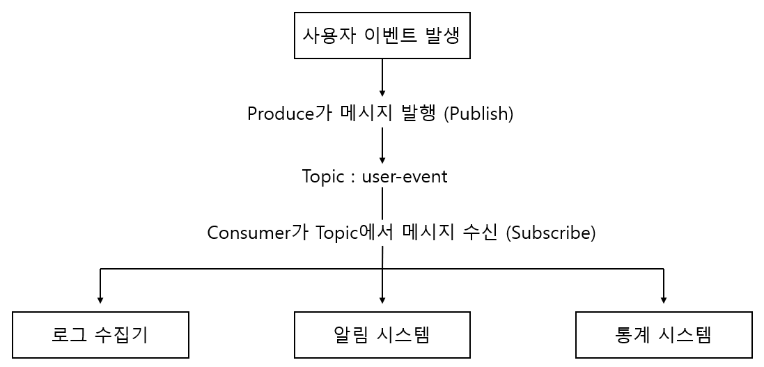 전체적인 Pub/Sub 패턴을 나타낸 그림입니다. 사용자 이벤트가 발생하면 해당 이벤트를 user-event라는 Topic에 발행(Publish)하며 여러 시스템(로그 수집기, 알림 시스템, 통계 시스템)이 해당 Topic를 구독(Subscribe)하고 있어 이벤트가 발생될 때 마다 각자 메시지를 수신하고 독립적으로 처리할 수 있습니다.