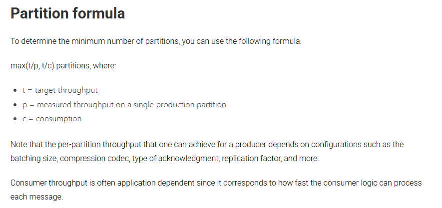 컨플루언트 Docs를 보면 max(t/p, t/c) partitions와 같은 공식을 기준으로 파티션 수를 계산하라는 언급이 있습니다.
