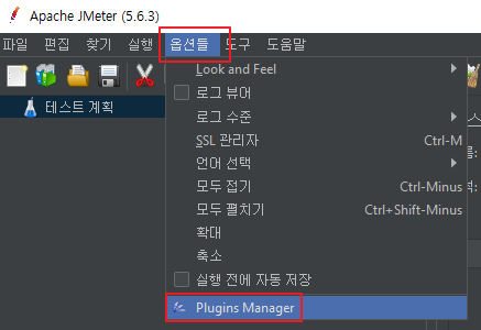 설치가 완료 되었다면 bin/ApacheJMeter.jar를 클릭하여 실행 후 Plugins Manager를 클릭해주세요. (만약 이미 JMeter가 실행중이었다면 재시작을 해주시면 보입니다)