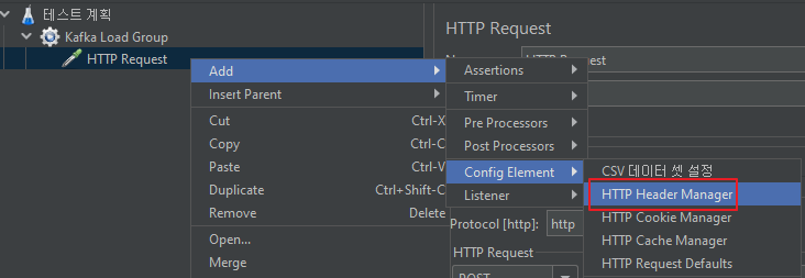 이제 위에서 만든 HTTP Request를 우클릭하여 Add → Config Element → HTTP Header Manager를 클릭해주세요.