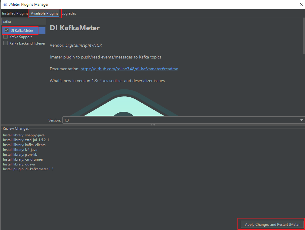 Available Plugins → DI KafkaMeter를 체크하고 Apply Changes and Restart JMeter를 클릭하여 적용해주세요.
