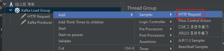 Add → Sampler → HTTP Request를 클릭해주세요. 위에서 생성한 쓰레드 그룹을 우클릭 해주셔야 보입니다.