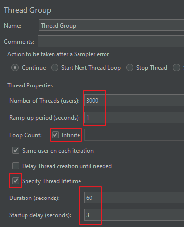 다음과 같이 설정합니다. 3000명의 사용자(Number of Threads)가 1초에 모두 시작(Ramp-up period)하며 LoopCount Infinite는 각 유저들이 종료되지 않고 계속적으로 반복을 수행하게 합니다. 60초 동안 테스트를 진행(Duration) 하며 실행 후 3초 뒤 시작(Startup delay) 하는 설정입니다.