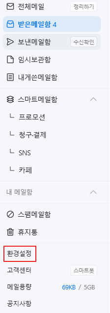 인증 구현을 위해 네이버 로그인 및 메일로 이동하여 좌측 하단의 환경설정을 클릭합니다.