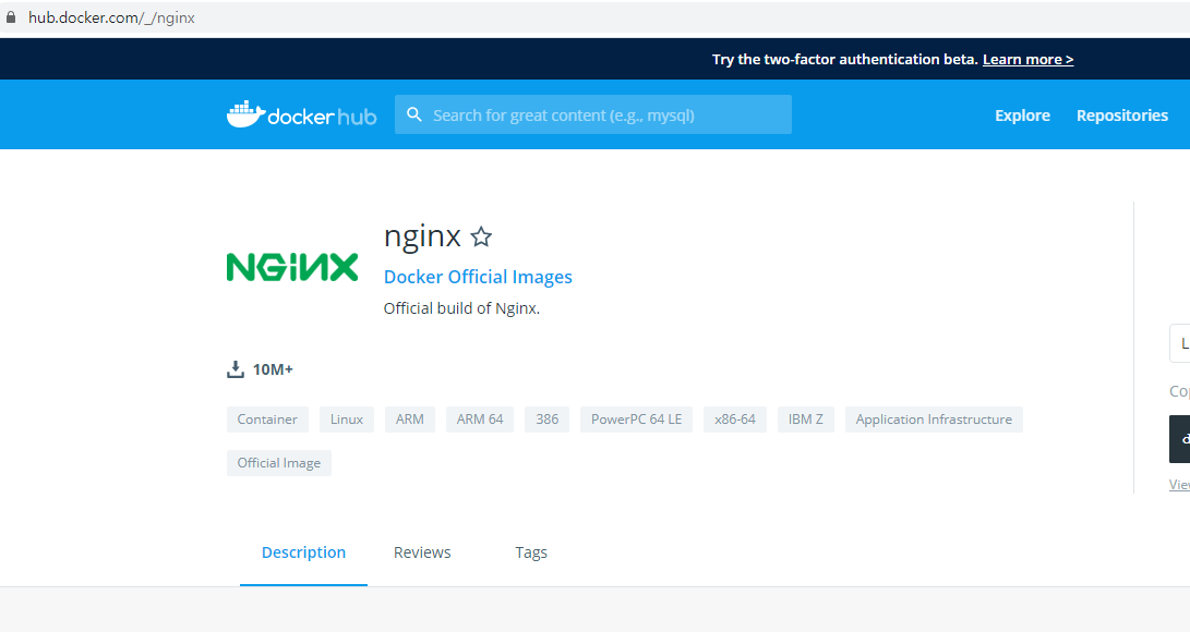 https://hub.docker.com/_/ngin 에서 아래 이미지와 같이 패키징 되어있는 nginx 이미지를 확인할 수 있습니다.