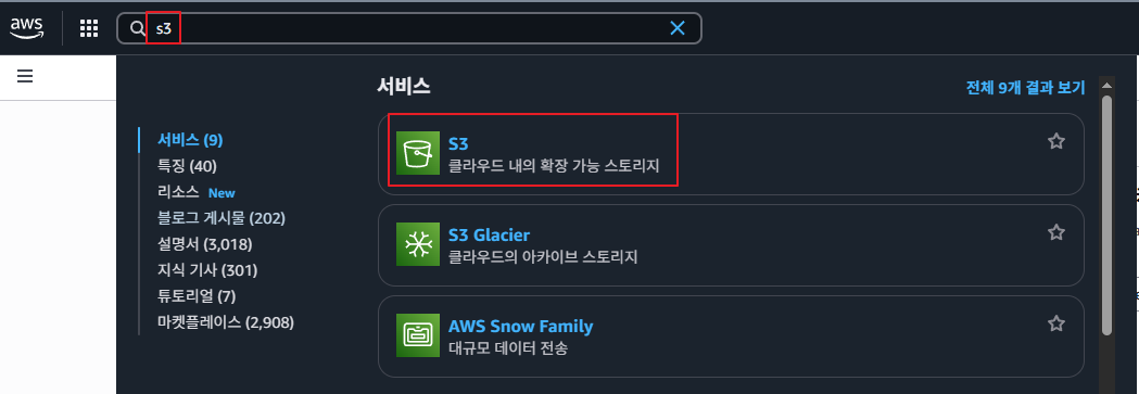 우선 가장 먼저 AWS에 로그인하여 콘솔에서 s3를 검색한 후 클릭하여 서비스에 들어가주세요.