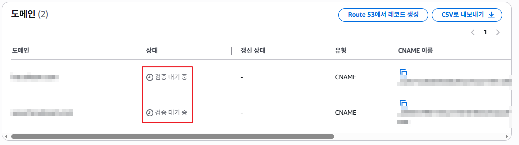 처음엔 "검증 대기 중"으로 되어있으며 이후 가비아 도메인 연동 등 추가적인 설정 이후 완료될 것 이기 때문에 우선은 무시한 채 아래의 가비아 도메인 연동 설정을 진행해주세요.