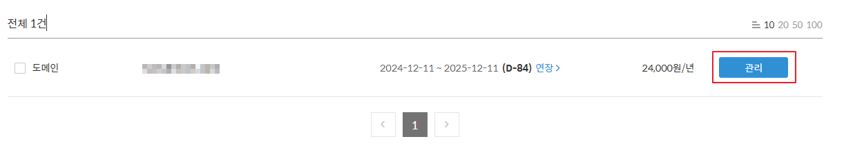 미리 구매해둔 도메인을 확인하고 우측 "관리" 버튼을 클릭합니다.
