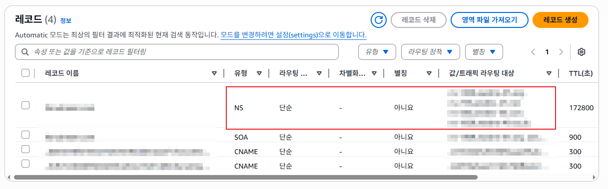 AWS Route53을 보면 NS 유형에 총 4개의 값이 보일겁니다. 이 값들을 각각 가비아에서 1~4차의 호스트명에 입력하여 적용해주세요. 순서 상관 없이 값들을 채워 넣어주면 됩니다.